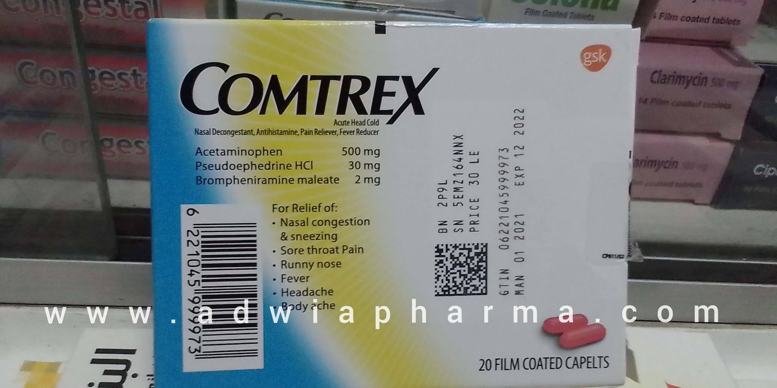 كومتركس أقراص يتكون من اسيتامينوفين500مجم وهى مادة خافضة للحراره ومسكنة للألم +سودافيدرين هيدروكلوريد 30مجموهى مادة مضادة للهستامين ومضادة لأحتقان الأنف والرشح والحساسيه +برومفنيرامين ملايات 2مج وهى مادة مضادة للهستامين لتخفف من أعرض الحكه والرشح وسيلان الأنف وحساسية العين المائيه وهو من إنتاج شركة جلاكسو سميثكلاين مصر